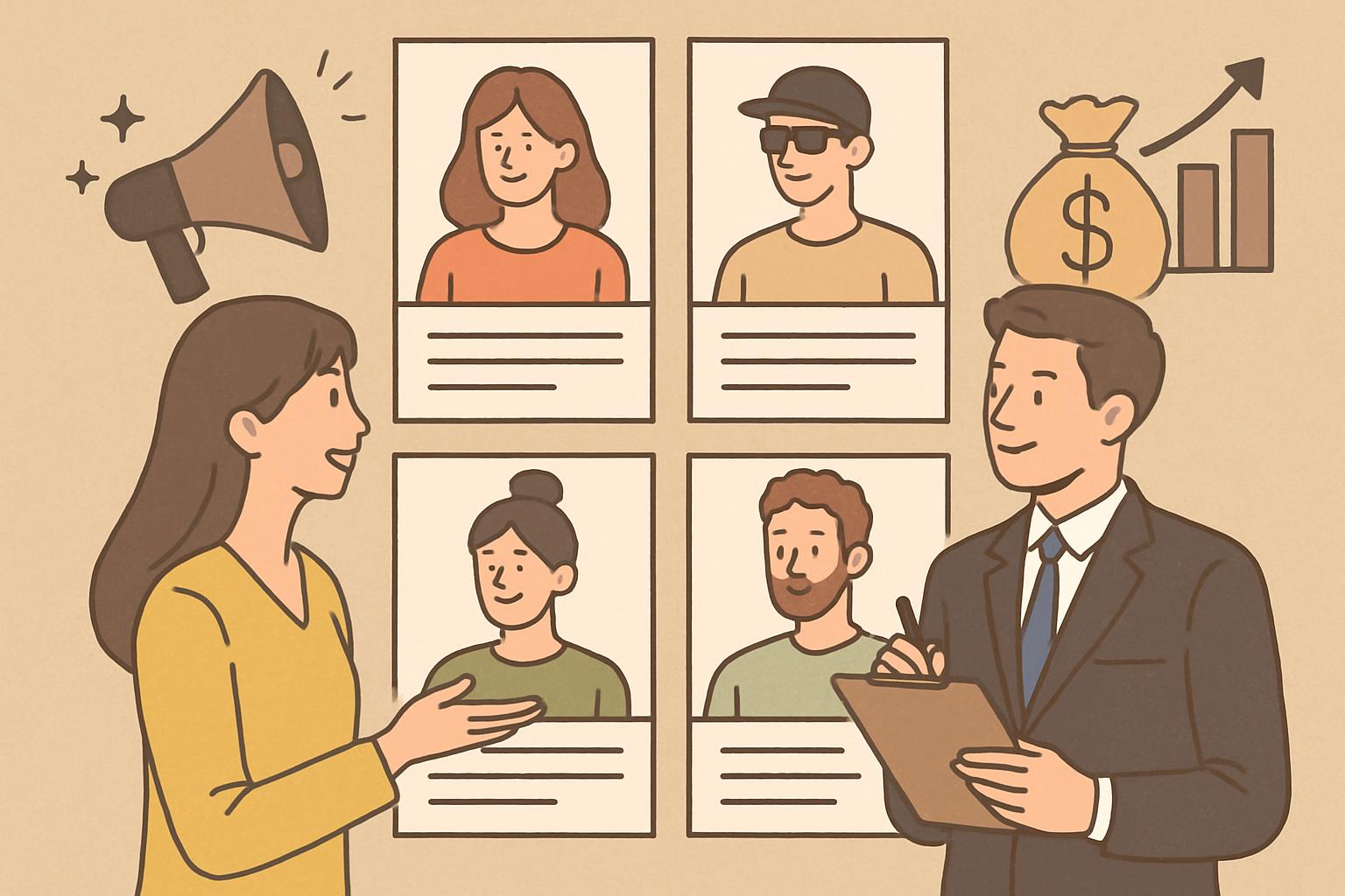 キャスティング会社とは、広告やイベント、映像作品などにタレント、モデル、インフルエンサー、文化人などを起用したい企業(クライアント)と、タレントが所属する芸能事務所やプロダクション、個人で活動するインフルエンサーなどを仲介する専門会社です。企業の目的や予算、企画内容をヒアリングし、数多くの候補者の中から最適な人材を提案し、出演交渉から契約、当日のサポートまでをワンストップで代行します。広告代理店や制作会社、一般企業など、幅広いクライアントの多様なニーズに応える、いわば「キャスティングのプロフェッショナル集団」です。